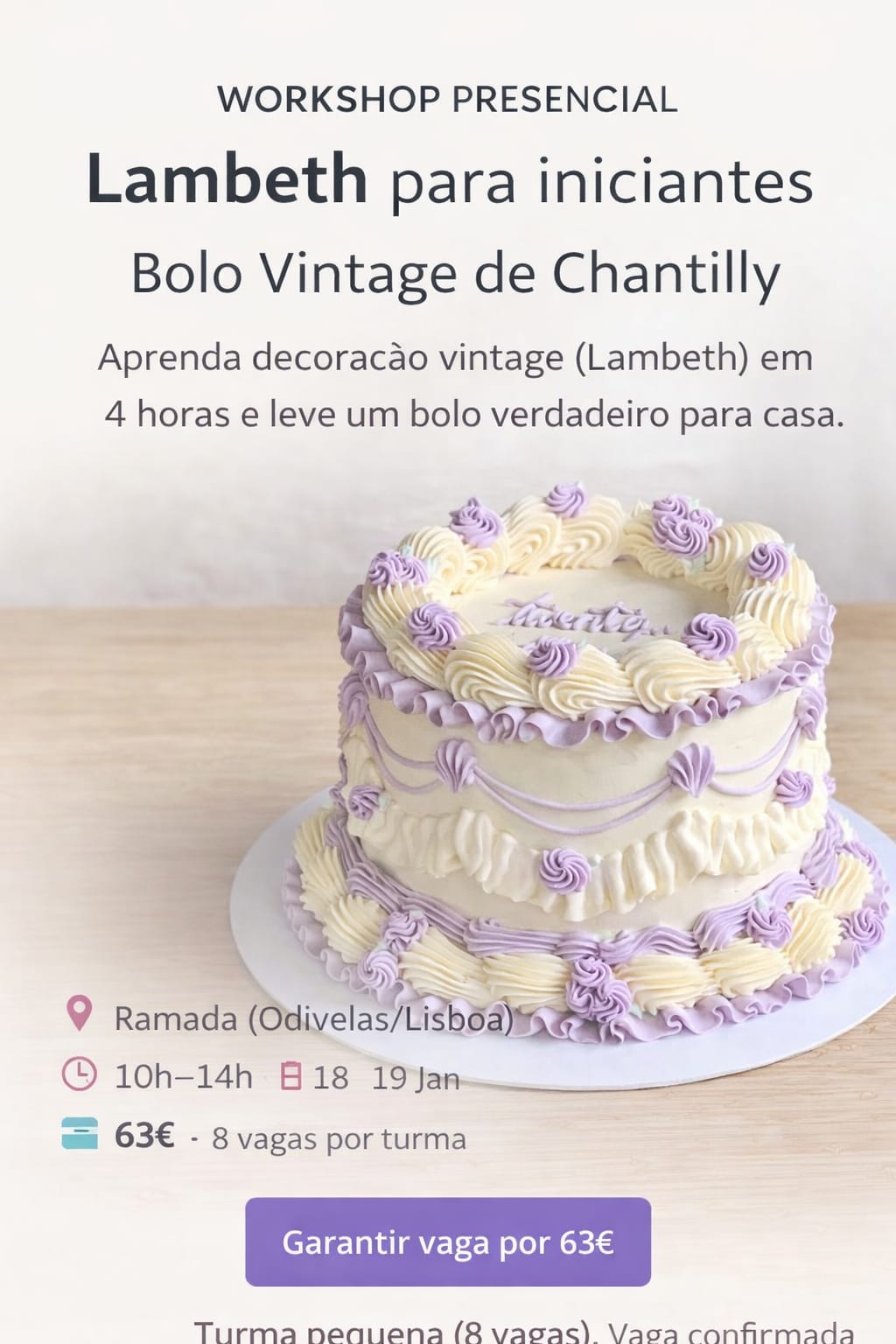 Se procuras um workshop lambeth lisboa para evoluir rapidamente, ganhar segurança e elevar o nível dos teus bolos vintage, esta é a tua oportunidade. As vagas são limitadas e a reserva é confirmada após pagamento.